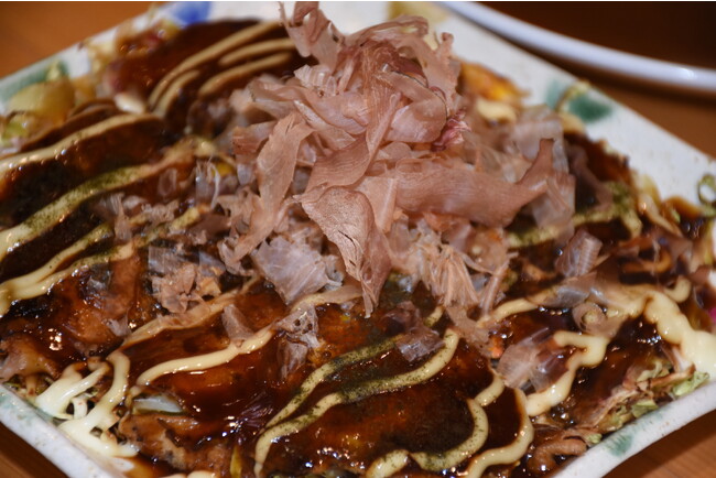 「ALL豊橋産 米粉のグルテンフリーお好み焼き」(1100円)を作った「鉄板焼き とらのこ」(駅前大通り1)。小麦粉よりもモチモチとした食感で、腹持ちもよく、具材のうずら卵と豚肉、キャベツ、塩麹とすべて地元産にこだわりました。青ノリの代わりに州田園の大葉粉をかけて仕上げています。米粉を提供した「清須ライスセンター」は、「よく味わうとお米の風味もあり、食感も米粉ならでは。ぜひご堪能ください」とPRしました。