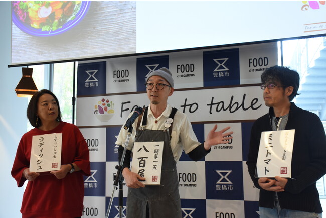 前回は4店舗と7農家により10の新メニューが誕生しましたが、今年は最終的に25の新メニューが13店舗と12農家により開発されました。マスコミ向けに行われた新メニュー発表会では、各グループがメニュー開発の秘話や意気込み、こだわりなどを4分間で発表しました。