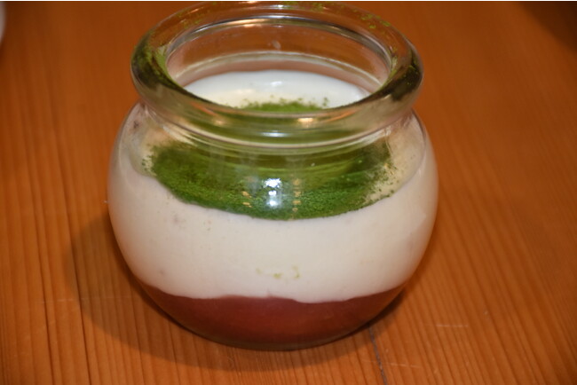 「和食専門ビュッフェ 和の膳おざき」(磯辺下地町)が開発したのは、もっちりとした「米粉のプリン」(400円)。下に敷かれたイチゴソースは甘酸っぱく、上にかかったほろ苦い抹茶がアクセントになっています。「磯田園製茶株式会社」は「飲食店と作り手がコミュニケーションをしっかり取りながら進められたことがすごく楽しかった。だから良いものができたんだと思う」とマッチンングのメリットについて語りました。