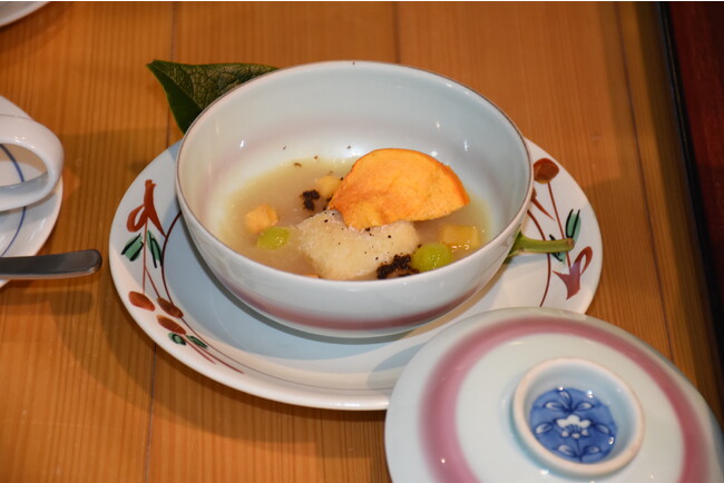 続く「ふぐ・日本料理 大村屋」(大橋通1)の「ベル・ファームさんの次郎柿と百合根の饅頭」(880円)は、次郎柿をそのまま生だけでなく、パリパリ食感のチップと完熟した次郎柿のジャムも使い、次郎柿の食感と甘味を生かしました。百合根のペーストに米粉を混ぜて柿ジャムを包んだ饅頭は、カツオと昆布の出汁をベースにしたあんかけに濃厚な次郎柿を合わせた一品。大村屋は「地元では柿をもらうことが多いと聞き、次郎柿を料理の一品として皆さまに召し上がっていただくことで、より次郎柿の価値を高める機会になればと思います」と意気込みました。