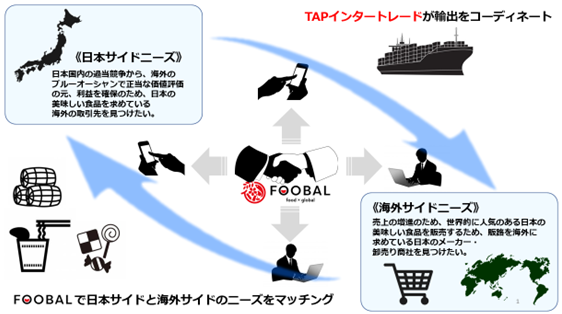 株式会社TAPインタートレード(ティエイピイ インタートレード 本社:東京都江戸川区 代表取締役:田島俊明)は、日本の食品製造メーカーと海外市場とをマッチングするプラットフォームサイト『FOOBAL(フーバル)』を2022年11月1日より運用開始いたします。 FOOBALとは、FOOD×GLOBALの造語で、日本産食品を海外市場に輸出したい製造業者等と、日本産の輸入食品を取り扱いたい海外の流通事業者、バイヤー、飲食店等が無料で登録・利用できる事業者向け会員制サイトです。
