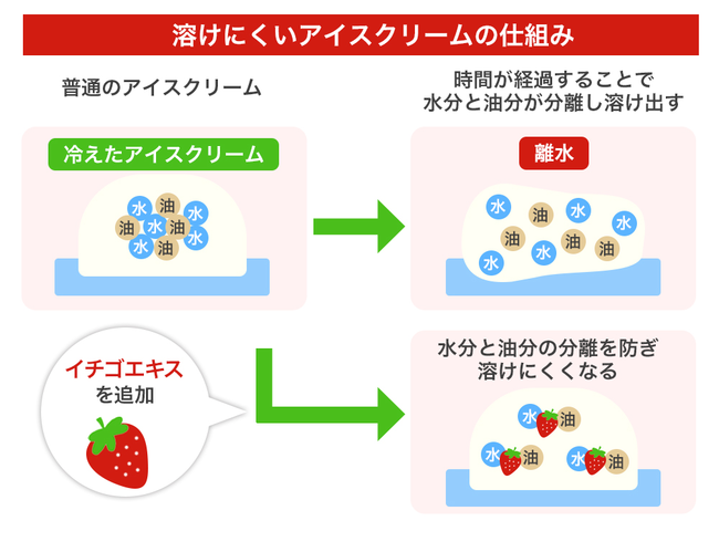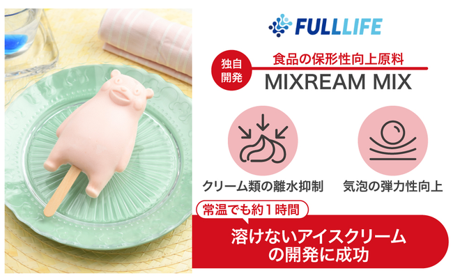 FULLLIFE株式会社の提供するMIXREAM MIXには、主に2つの機能があります。一つ目はアイスクリームや生クリームなどクリーム類の離水を抑制して溶けにくくする機能です。二つ目は、気泡の弾力性を向上させて崩れにくくする機能です。つまり、この原料により溶けにくいアイスクリームが作れるのです。