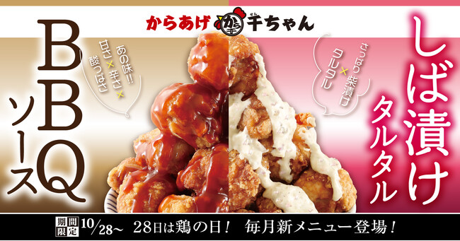 海鮮居酒屋「はなの舞」「さかなや道場」等を全国展開するチムニー株式会社(本社:東京都墨田区 代表取締役社長:茨田 篤司)は、同社の「からあげ千ちゃん」にて、同店の看板メニューである旨塩からあげに「BBQソース」と「しば漬けタルタル」をトッピングした商品を期間限定で10/28(金)より販売します。