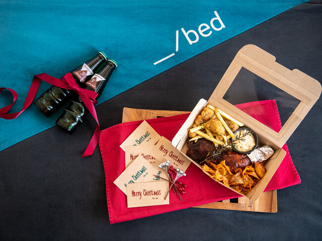 オリジナルターキーレッグ、フィッシュ&チップス、ペンネアラビアータとボリューム満点のディナーBOX(1ドリンク付き)。全室プロジェクター完備の客室で、映画やライブ鑑賞をしながらで気軽にクリスマスディナーをお楽しみください。
