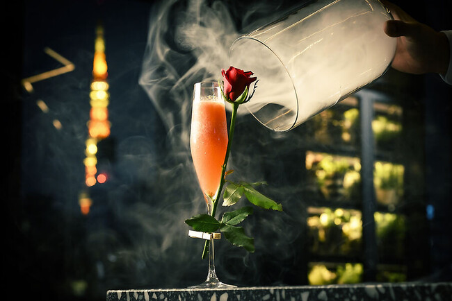 都民向けの超得プラン!ホテル最上階の東京タワーを望むメインバーTHE LIVELY BARにて、ベリーベースのクリスマスカラーが可愛らしい特別なカクテルをご用意。スモークとバラの演出はサプライズにもぴったり。カクテルはオードブルと一緒にお楽しみください。ルームサービス対応も可能。
