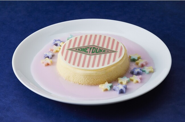“ハニーデュークス”のロゴをプリントしたチョコをのせたストロベリー風味のふわしゅわ食感スフレケーキ。淡いピンク色のソースと、カラフルな星形の“おふ”で見た目もポップに仕上げました。