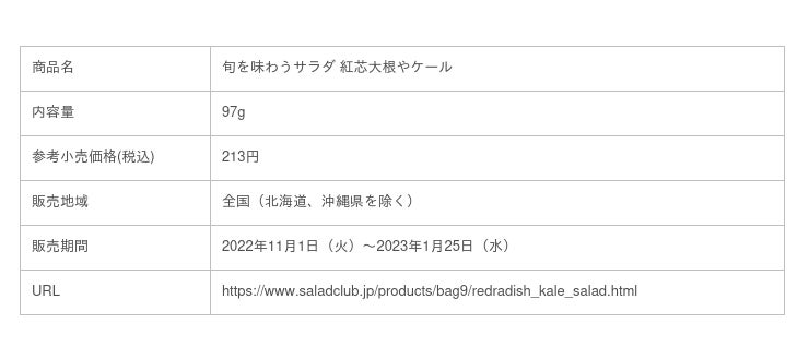 株式会社サラダクラブ(代表取締役社長:金子俊浩、本社:東京都調布市)は、2022年11月1日(火)から2023年1月25日(水)までの期間限定で、「旬を味わうサラダ 紅芯大根やケール」(97g/税込213円)を発売します。