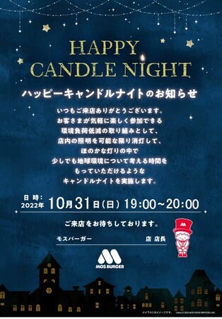 冬の寒さに備える季節を迎えるなかで、世界的なエネルギー不足が懸念されています。モス バーガーでは「ハッピーキャンドルナイト」を実施することで、普段と異なる雰囲気の店舗でハロウィンを楽しんでいただくとともに、エネルギーの重要性、省エネについて考えていただける機会をご提供します。合わせて、持続可能な開発目標(SDGs)の達成に向けた意識の大切さをお客さまへ呼びかけるため、多様な食文化に対応している「グリーンバーガー<テリヤキ>」の割引提供も併せて行います。