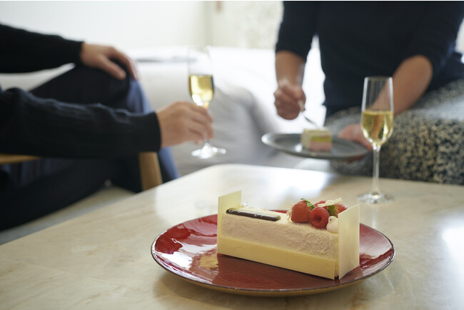 幅広い年齢層にも受け入れられるよう口どけ滑らかで、軽やかなムースを使ったパティシエメイドのクリスマスケーキと、スパークリングワインがセットになった宿泊プラン。