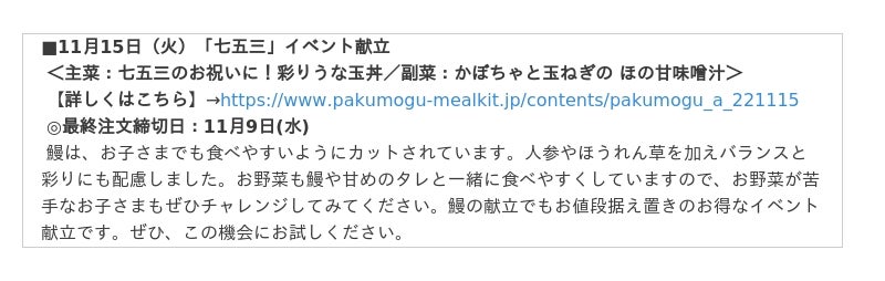 ワタミ株式会社(東京都大田区、以下ワタミ)が手がける食事宅配サービス「PAKU MOGU(パクモグ)」では、お子さまに楽しんでいただけるよう季節ごとのイベント献立を提供しています。11月15日(火)は、「七五三」に合わせお祝いをイメージしたイベント献立を販売いたします。「PAKU MOGU」は、野菜もおいしく食べられるように、野菜の大きさにも配慮し、野菜嫌いの子どももおいしく食べられるような工夫をしています。野菜を食べなきゃいけないというよりも、「自分の好きなものを食べたら野菜が食べられた!」と子どもが感じられるような献立を意識しています。「七五三」のお祝いにお子さまの成長を家族みんなでお祝いできるよう、