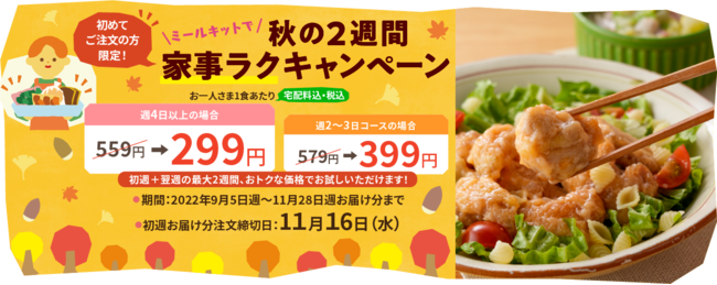 これから「PAKU MOGU」を始める方は、週4日以上のご注文でお1人さま1食あたり299円よりご注文できる「秋の2週間家事ラクキャンペーン」をご利用いただけます。初週+翌週の最大2週間、おトクな価格でお試しいただけますので、ぜひこの機会にご利用ください。