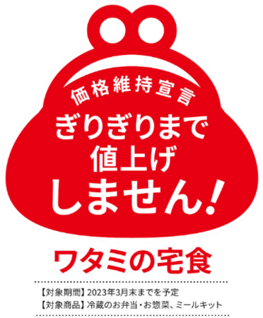 「ワタミの宅食」は、2023年3月末まで、現行の商品価格※を維持し、値上げせず提供することを決めました。食材・エネルギー等の原料価格の高騰、そして急激な円安が続いており、当社においても他社と同様、大きく影響を受けております。お客さまの家計への負担を増やさず、日々の食生活を少しでもサポートしたいという思いから、ぎりぎりまで値上げしない方針です。仕入れ・購買方法の見直し、製造工程の改善など、自社で可能な限りのコスト削減や合理化を図り、品質を保ちながら価格維持に努めます。2023年3月以降については、今後の経済市況・為替の変化を踏まえて判断してまいります。