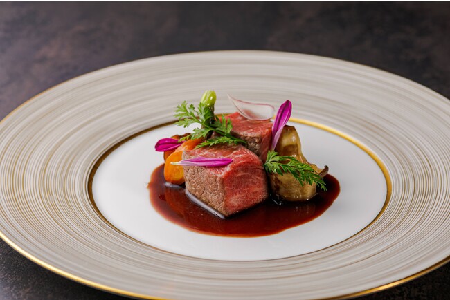 メイン料理はお二人の幸せを願い、千葉のブランド牛「しあわせ絆牛」を使ったお料理をご用意。「信頼の絆」「環境の絆」「家族の絆」を大切にするという想いから名づけられたこのお肉は、程よい霜降りと柔らかな赤身肉の食感が特長です。さっぱりとした食感をお愉しみください。