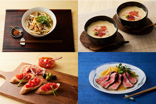 (写真左上から)焼きお揚げときのこのうどん、茶わん蒸し、角切りトマトのブルスケッタ、牛肉のタタキ 和風マリネ