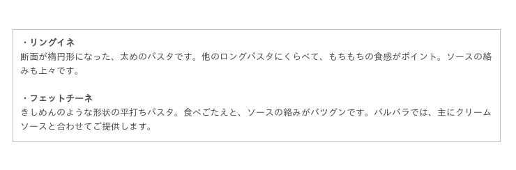 生麺でご用意するバルバラのパスタは”リングイネ”と”フェットチーネ”の2種類を、ソースに合わせてご用意。