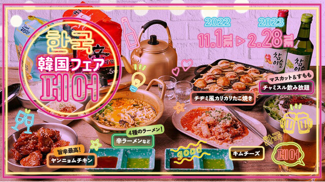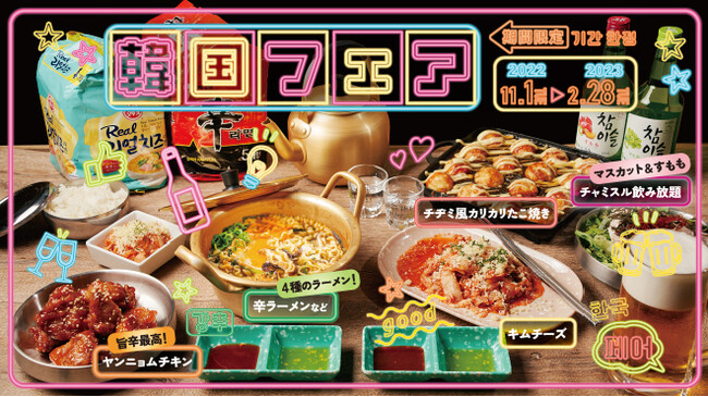 GOSSO株式会社(本社:東京都渋谷区 代表取締役:藤田建)が運営する「肉ときどきレモンサワー」にて、2022年11月1日(火)~2023年2月28日(火)の期間限定で、韓国旨辛B級グルメ「ヤンニョムチキン」をはじめ、韓国ドラマにも登場する"あの”インスタントラーメンなど「一度は食べてみたい!」憧れの韓国グルメを食べ放題で楽しめる、『韓国フェア』を開催致します!