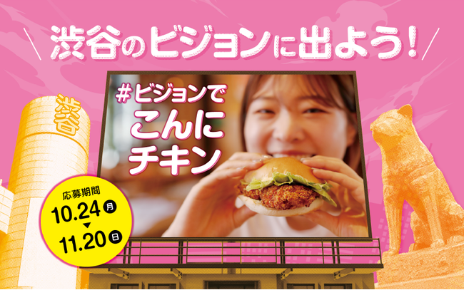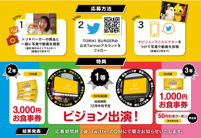 TORIKI BURGER店舗でご購入された商品と一緒に写真や動画を撮影し、「♯ビジョンでこんにチキン 」 をつけて Twitter に投稿すると、抽選で30名(組)様の投稿された写真や動画が、渋谷センター街・東急ハンズ前ビジョンに映ります。キャンペーン特典はビジョン出演の他、お食事券やクーポンもございますので、たくさんのご応募をお待ちしております。