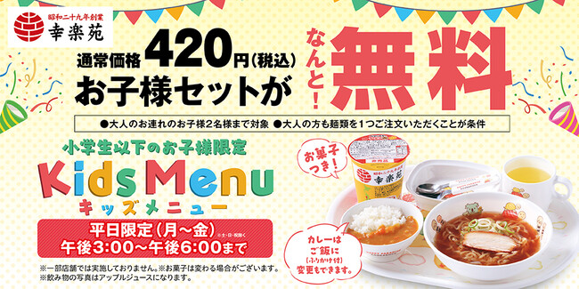 店内でお召し上がりのお客様限定、大人の方が麺類1つをご注文の場合、らーめん、カレーライス、ジュースにお菓子がついた通常価格420円(税込)の「お子様セット」を平日15時~18時の間、なんと無料でご提供!