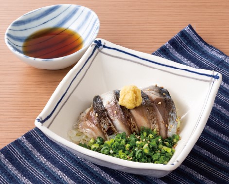 コクのある旨みとキメ細やかな脂がのった「金華さば」を、〆さばとしてご提供。ご提供前に皮を炙った〆さばは、たっぷりの薬味とポン酢でお召し上がりいただく“土佐造り風”に仕上げました。