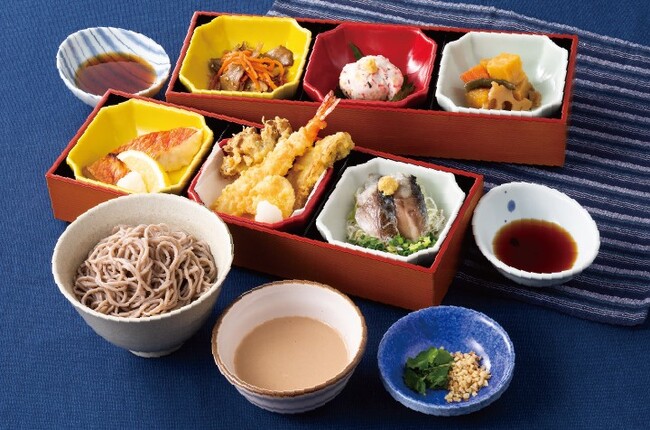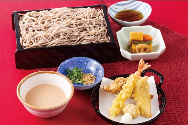 自家製くるみだれで召し上がる夢庵自慢の生(なま)蕎麦と、土佐造り風で提供する「金華〆さば」、塩焼きにした「金目鯛」、「季節の天ぷら」などのお惣菜6品で、季節を感じることのできるおもてなし和膳。天ぷらは「秋田県産白神あわび茸」・「新潟県産舞茸」・「栗」など、季節の素材を使用しました。