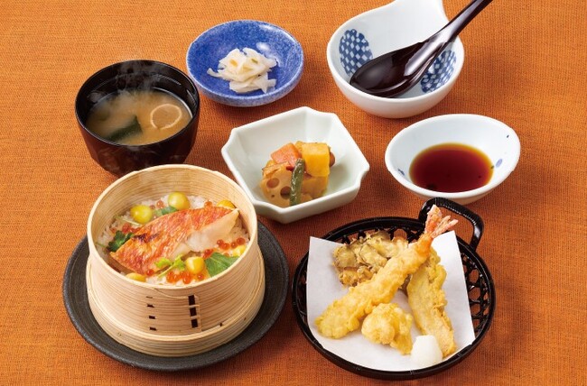 皮目を香ばしく焼き上げた金目鯛の塩焼きを、せいろ御飯の上に乗せ、提供前に蒸し上げます。御飯に広がる金目鯛の旨味が食欲を引き立てます。