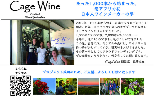 南アフリカのスワートランド、たった1000本のワインから始まった佐藤圭史の【Cage Wine】は、クラウドファンディングサイト「READYFOR」にてプロジェクトを公開し、開始11日目にして目標額200万円を達成しました。現在事業拡大中にて、良質なブドウの確保を目指し、複数のブドウ畑と契約するためのネクストゴール(500万円)に挑戦中!!最終日の11月17日(木)まで支援者を募集しています。プロジェクト詳細サイト: https://readyfor.jp/projects/cagewine