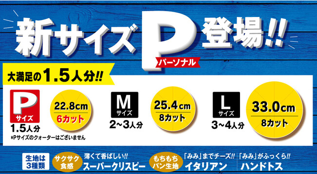 ピザーラではこの冬から、一人や二人でのたべごろサイズとなる新サイズ「P(パーソナル)サイズ」を導入。9インチ(22.8cm)の6カットでハーフ&ハーフもでき、追加でお好みのピザをお楽しみいただきたいときなどに幅広くご利用いただけます。