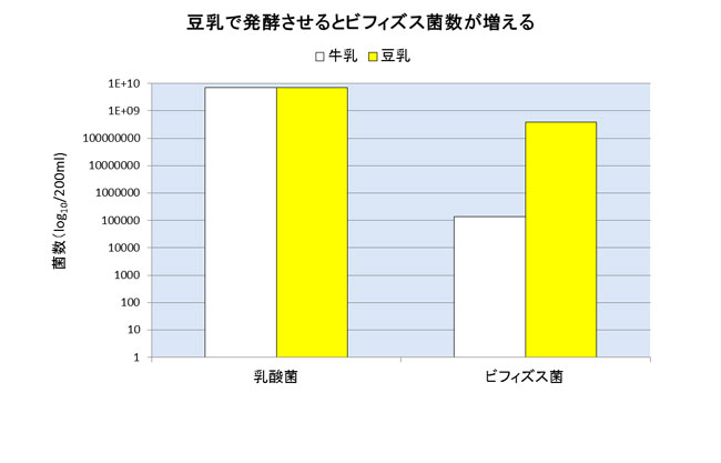 最近豆乳で発酵するお客様が多くなりましたが、牛乳と豆乳をプロバイオティクスGBN1で発酵させたところ、下図に示すように、豆乳で発酵させた方がビフィズス菌数が飛躍的に増えることがわかりました。プロバイオティクスGBN1の第二の特徴は、豆乳で発酵させるとビフィズス菌数の多いヨーグルトを作れることです。