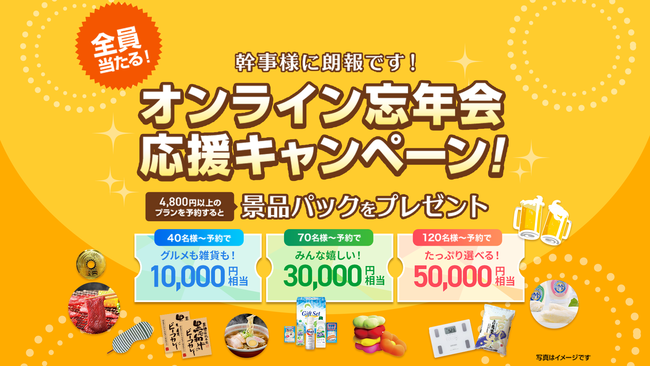 レストラン運営、ECサイト運営及びオンライン会食向け商品を扱う株式会社ムーンエレファントジャパン(本社:東京都豊島区東池袋3-1(58F) 代表取締役会長:南 有子)では、2022年12月中のオンライン忘年会を40名様以上のご予約でもれなく選べる景品パックが貰える「オンライン忘年会応援キャンペーン」を開催いたします。