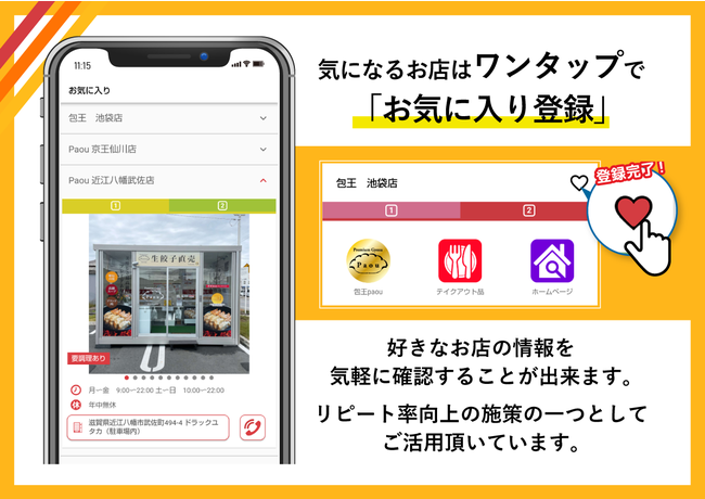 お店を「お気に入り登録」をすることもでき、検索する手間を省いて、お気に入りのお店の情報を確認することができます。