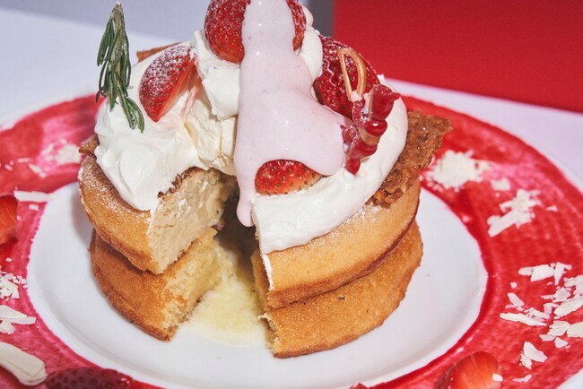 香り豊かな発酵“生”バターがパンケーキにじゅわっと染み込み、アーモンドチュイルのカリっとした食感と香ばしさが全体のアクセントに!チーズクリームの爽やかな酸味といちごの甘酸っぱさ、いちごミルキーソースのコクが相性抜群のひと皿です。