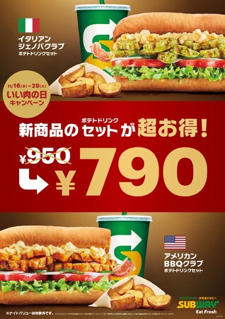 『イタリアンジェノバクラブ』と『アメリカンBBQクラブ』発売開始の11月16日(水)~11月29日(火)までの間、この2種の「ポテトドリンクセット」を通常950円のところ、160円OFFの790円でご提供します。