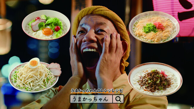 普段から「うまかっちゃん」を召し上がっていただいているユーザーの方々へお話を伺ったところ、「アレンジレシピを知りたい」「いろいろな食べ方でうまかっちゃんを楽しみたい」という声を多くいただきました。今回の「うまかっちゃん」の新CM内でも、小峠店主のユーモラスな表情と共にアレンジレシピを紹介しております。