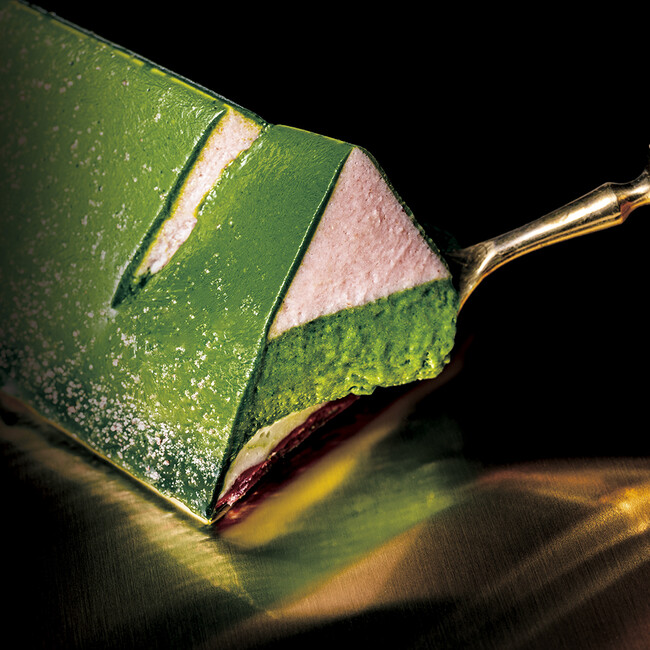 プレミアムという名のとおり、サクサクとした食感の「いちごショコラ・フィユティーヌ」の上に、濃厚な味わいを包み込むような優しい甘さの「ミルクガナッシュ」を添え、さらに口溶けなめらかな「抹茶」と「いちご」のショコラムースを一層づつ重ねた、贅沢なハーモニーがポイント。また、仕上げには、上品で大人なほろ苦さを添える「抹茶ショコラ・グラサージュ」でコーティングし、クリスマスらしいピンクのいちごパウダーで、見た目も華やかに彩ります。