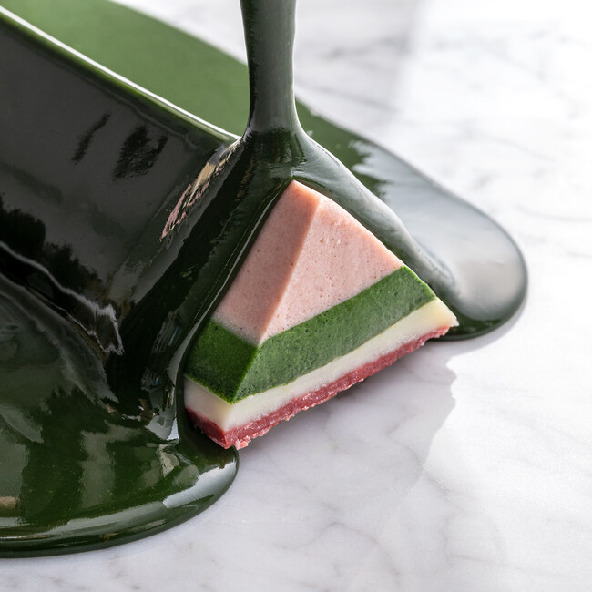 いちごの優しい甘みと酸味が引き立つように仕上げたムースは、香りや甘さを整え、抹茶と調和する味わいに。