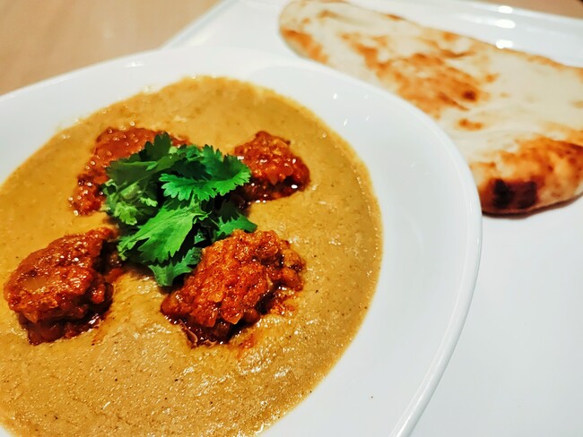 ホテルヴィスキオ尼崎ではこちらのカレーに、クミンやコリアンダー等スパイスを効かせトマトベースのソースで仕上げたスパイシーチキンを合わせ、ナンと一緒にお召し上がりいただけます。