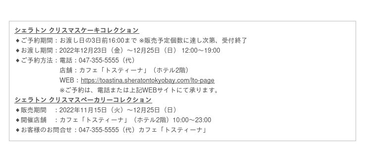 さらに、「クリスマスケーキコレクション」とあわせて、クリスマス定番の伝統的なベーカリーからシュトーレン3種、パネトーネ1種を、「シェラトン クリスマスベーカリーコレクション」として販売いたします。