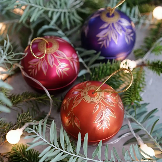 2022年は英国王立植物園「キューガーデンス」とのコラボデザインが実現しました。ボタニカルをコンセプトにしたデザインの丸型の缶は、オーナメントとしてクリスマスツリーに飾って楽しむことができます。缶の中にはアーマッドティーの誇る本格リーフティーが入っています(アルミ内袋付)。