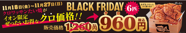 企画内容:名物クロワッサンたい焼6匹入ったお得な箱。イオンモール BLACK FRIDAYだけの96(クロ)価格で販売!