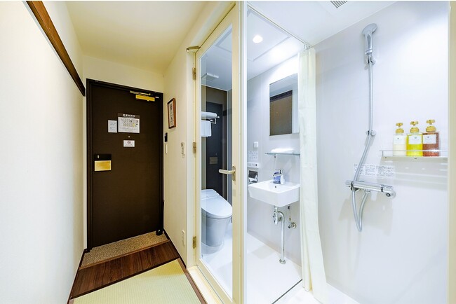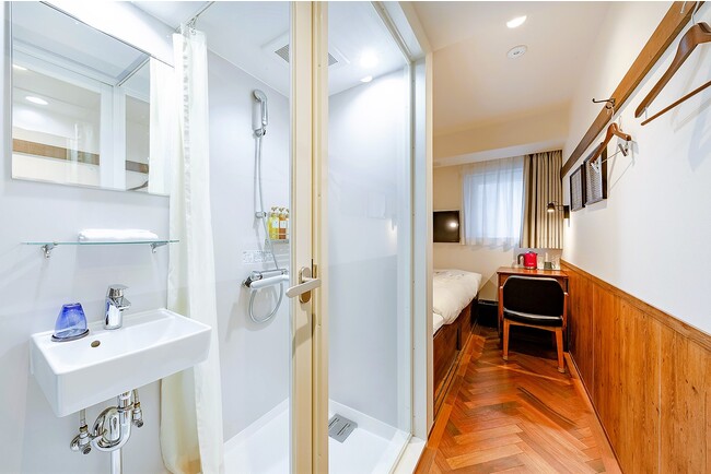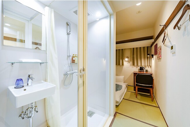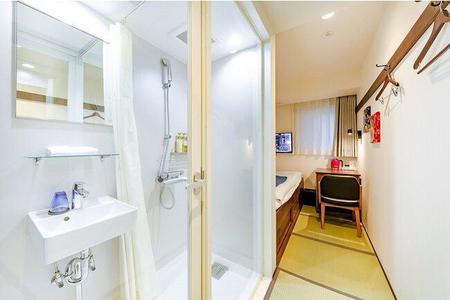 畳の部屋にお布団を敷く和室シングルを用意しました。コンパクトな客室ながらシャワーブースを組み込み、渋谷で日本らしい宿泊体験を提供します。