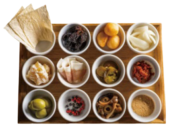 チーズたらの皮/いももち/「北見玉葱」のガリたま/ハラペーニョ/ドライトマトのオイル漬け/ペッパー黒・赤2種/十勝きなこ