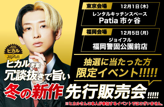 ファミリーレストラン 「ジョイフル」 を展開する株式会社ジョイフル (本社:大分県大分市三川新町一丁目1-45 代表取締役社長:穴見くるみ) は、日本のトップ動画クリエイターとして活躍するヒカルさんとの冬の新作コラボ商品の先行販売会を12月1日(木)に東京都、12月5日(月)に福岡県にて開催いたします。