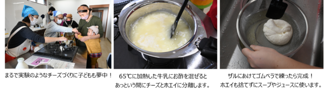 ノンホモジナイズド牛乳(通称ノンホモ牛乳)とお酢だけで完成するモッツァレラチーズづくりは、子どもから大人まで大人気でした。牛乳の温度をきちんと測れば、誰でも簡単にできるので、驚きの声が続々。