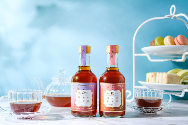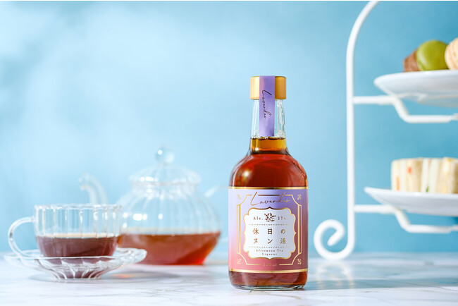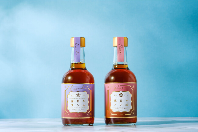 「休日のヌン活」とは、和紅茶や洋梨、ハーブが香る2種類の紅茶のリキュールセットです。ローズとラベンダー、それぞれの香りを楽しめる2種類のリキュールを一つのセットでお届けします。ホテルのラウンジやカフェでアフタヌーンティーをゆったりと楽しむ「ヌン活(アフタヌーンティー活動)」を、お酒で楽しめないかという思いから、商品化にいたりました。可愛らしいセイボリーやスイーツと合わせれば、おうちでアフタヌーンティー気分を味わえます。