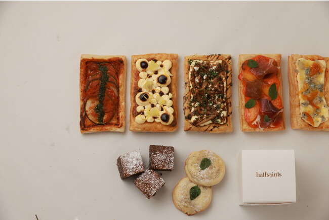 Half Saints TOKYOのコンセプトは「新しい発見/ 地域へのリスペクト/マリアージュ」です。マニラでも大人気のPuff Pizzaことパフピッツァを日本の食材もふんだんに取り入れて展開します。カリッと風味豊かな「丸めないクロワッサン生地」に重なる具材は、エリンギとゴートチーズ、ラタトゥイユ、生ハムと柿など季節の果物、北海道ブルーチーズと自家製シトラスジャムの組合せなど「新しい発見」のある味を追求しました。ベースに使うマリナラ(トマトソース)やピメント(赤ピーマンのソース)も手作りしています。