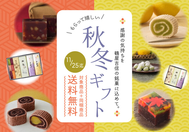和菓子製造販売の株式会社 鶴屋吉信(つるやよしのぶ)(本社:京都市上京区、代表取締役社長:稲田慎一郎)は、秋冬のごあいさつに、お歳暮のさきどりにもおすすめな選りすぐりの和菓子を、全国どこでも送料無料でお届けする「もらって嬉しい 秋冬ギフト WEB限定送料無料キャンペーン」を2022年11月1日(火)~11月25日(金)まで公式オンラインショップにて開催いたします。