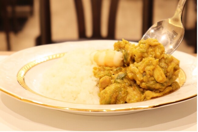 日本でカレーが食べられ始め、”はじめてカレーを食べた”記述を明治人たちがたくさん残しています。西洋野菜などがない時代、日本古来の農産物で、葱と生姜などを”ボートル”(江戸時代にはバターのこと)で炒めてメリケン粉(小麦粉)をいれたカレーライスをモチーフだけでなく、当時の西洋料理店向け料理書、家庭向け料理本などから、複合的にあわせ、相対的再現を試み、実現しました。150年前に食べられていたカレーの味わいをお楽しみいただくことはもちろん、サスティナブルな1皿を食べることによって、未来の持続可能な食へも想いを馳せていただけるよう、ご説明資料もご用意しております。