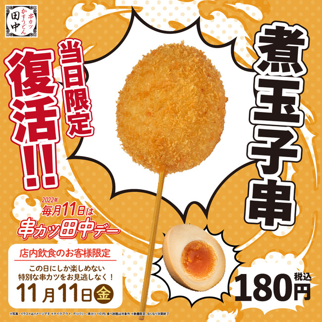 お客様だけでなく、多くの従業員が復活を待ち望んでいた「煮玉子串」が、2年ぶりに限定復活します。煮玉子をまるまる1つ揚げたダイナミックな見た目かつ非常にボリューミーな串カツで、見て楽しく食べて楽しい1品となっております。多くの人を虜にした幻の串カツを、ぜひお召し上がりください。この日を逃すと食べられないかも!?