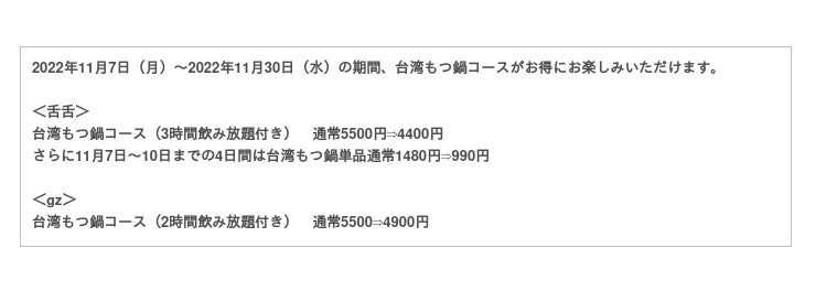 株式会社ゼットン(本社:東京都渋谷区、代表取締役社長:鈴木伸典)が運営する「舌舌(タンタン)」「gz(グズ)」では、11月7日の"もつ鍋の日"にちなみ、2022年11月7日(月)~2022年11月30日(水)までの期間限定で「台湾もつ鍋キャンペーン」を実施いたします。あったか鍋特集2022‐2023>>>https://www.zetton.co.jp/news/page/2022-2023.php