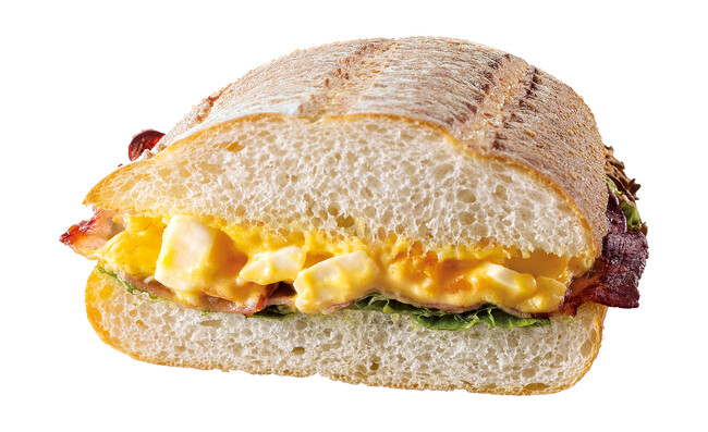 商品紹介:サンマルクカフェオリジナルのタマゴサラダと、こんがり焼いたベーコンをサンドしました。ゆで卵がゴロゴロっと入りタマゴのコクとまろやかさがポイント。シンプルだからこそ美味しい!